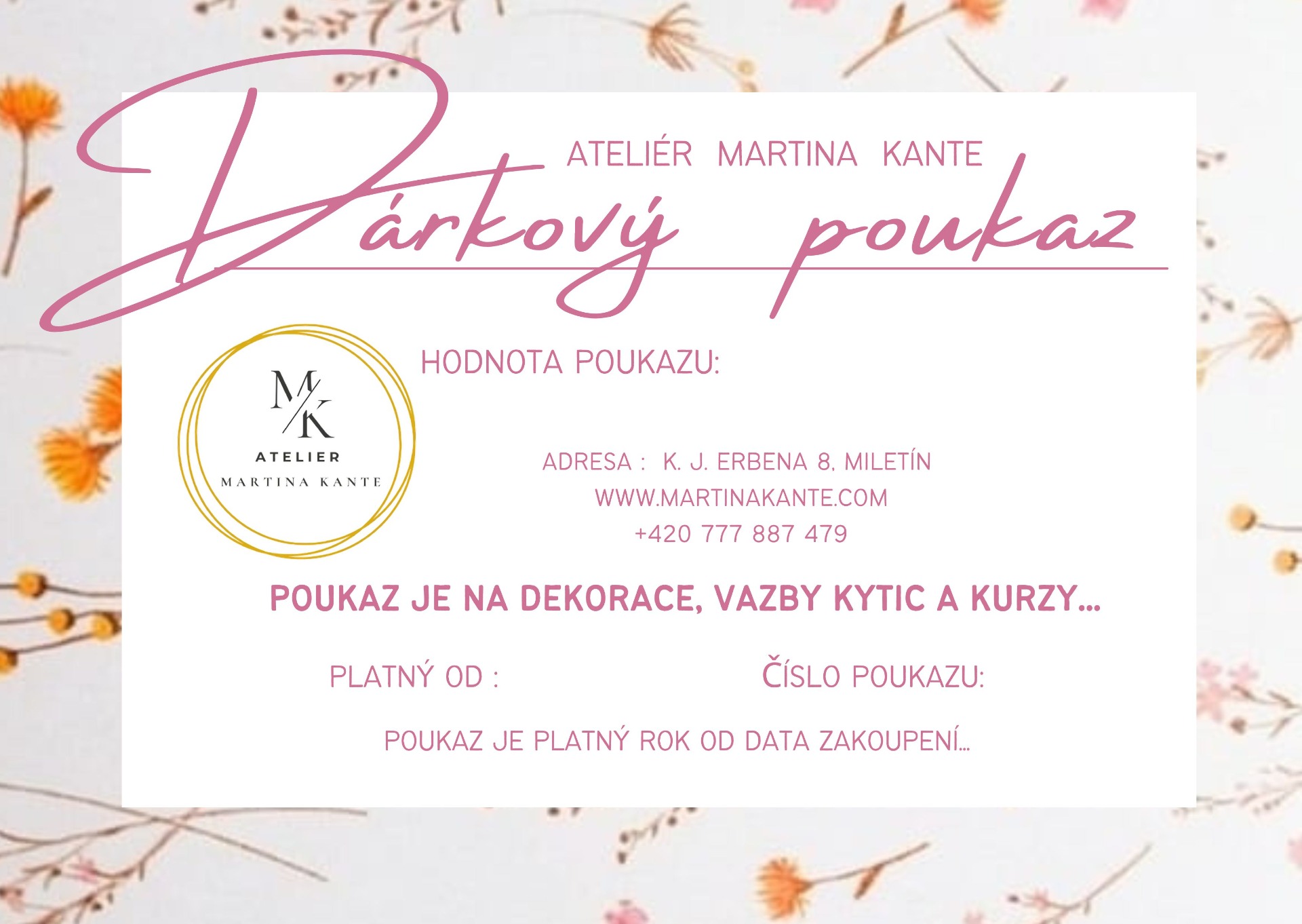 Kurz tvorby dekorací do interiéru, dle ročního období nebo celoroční výzdoba. Jedná se věnce nebo osazování nádob, trvalé dekorace do interiéru. Poukaz lze použít i na nákup již hotových dekorací či produktů v ateliéru. Dárkový poukaz na kurz, platný rok od data zakoupení.
