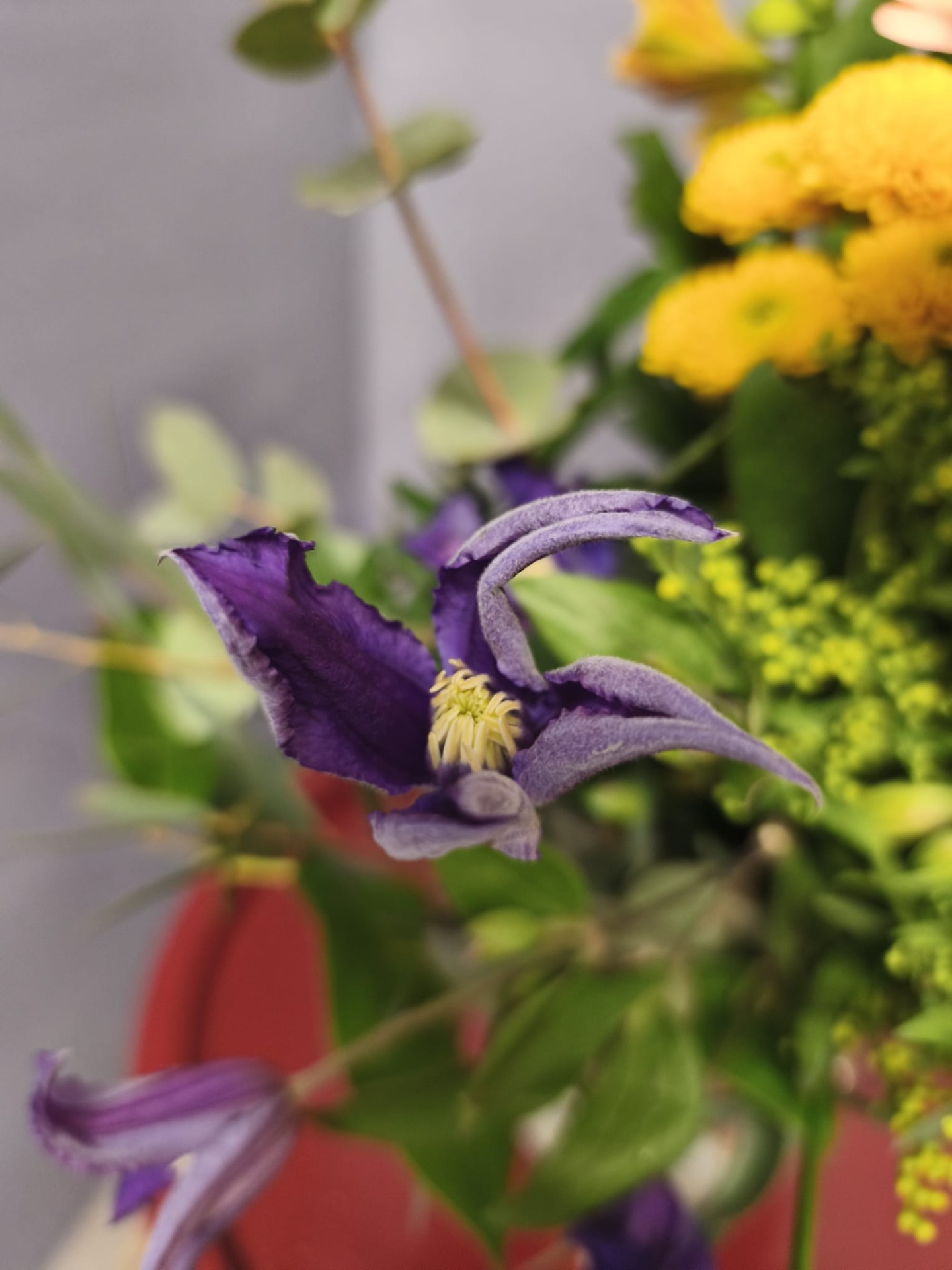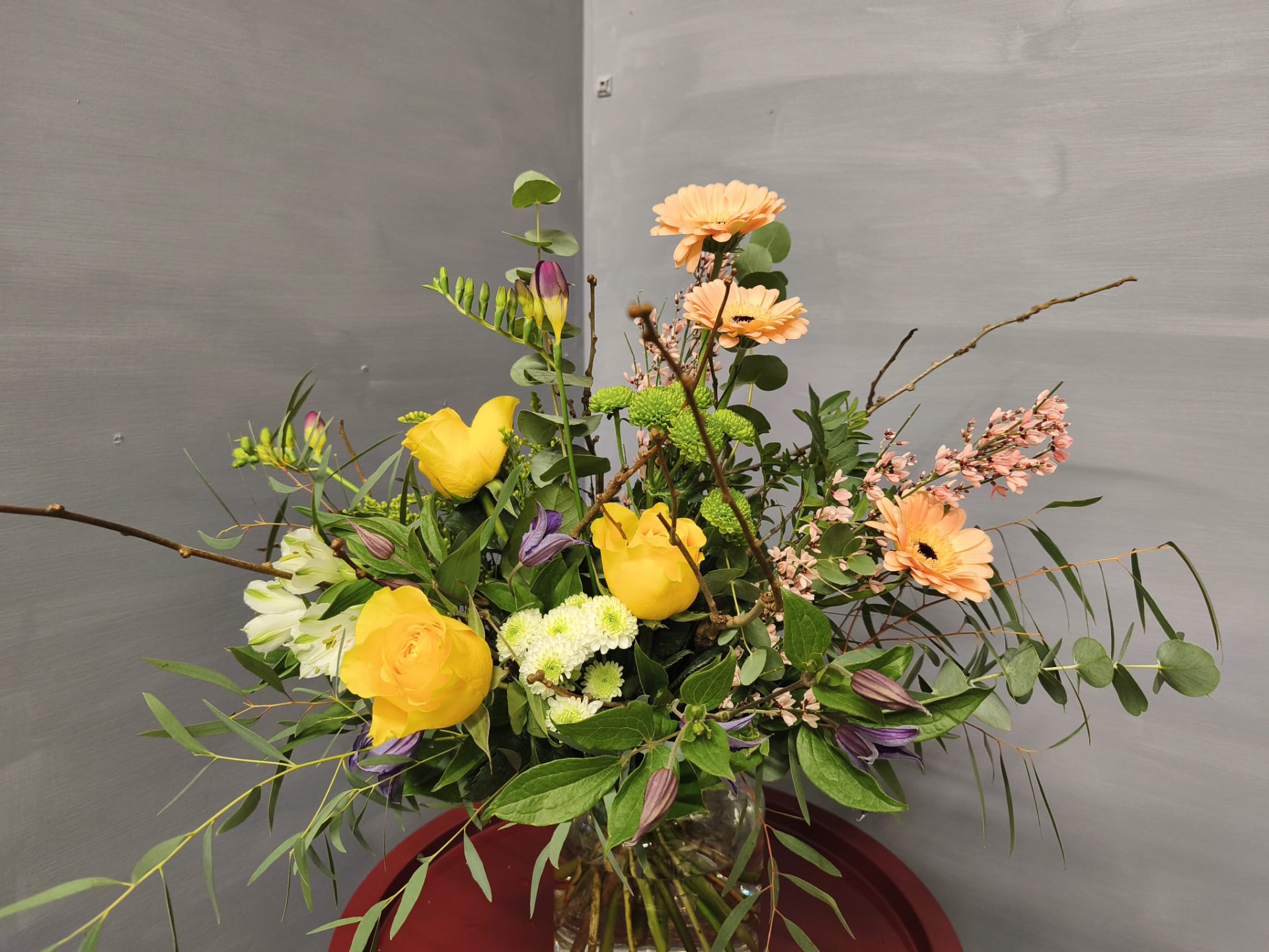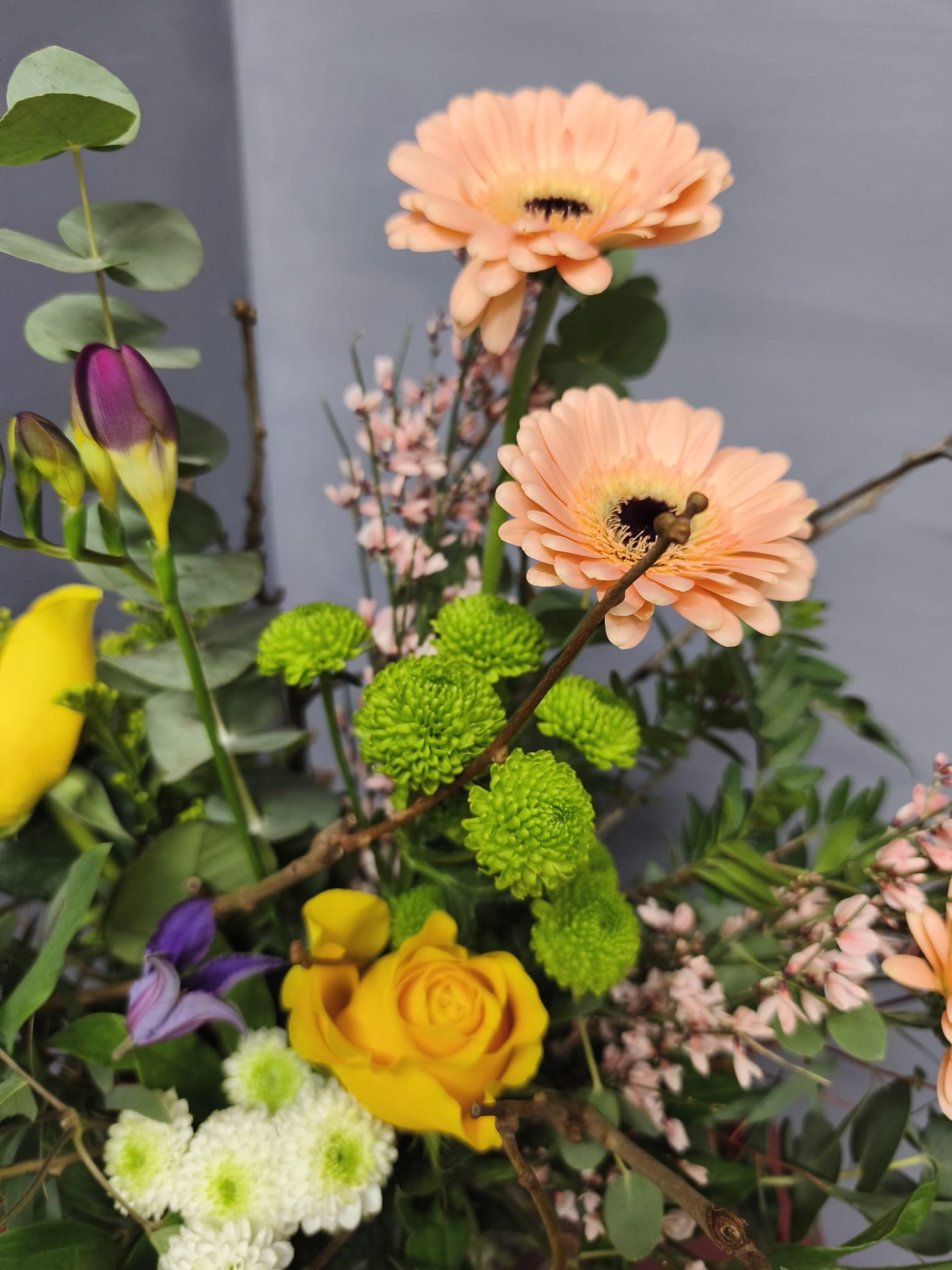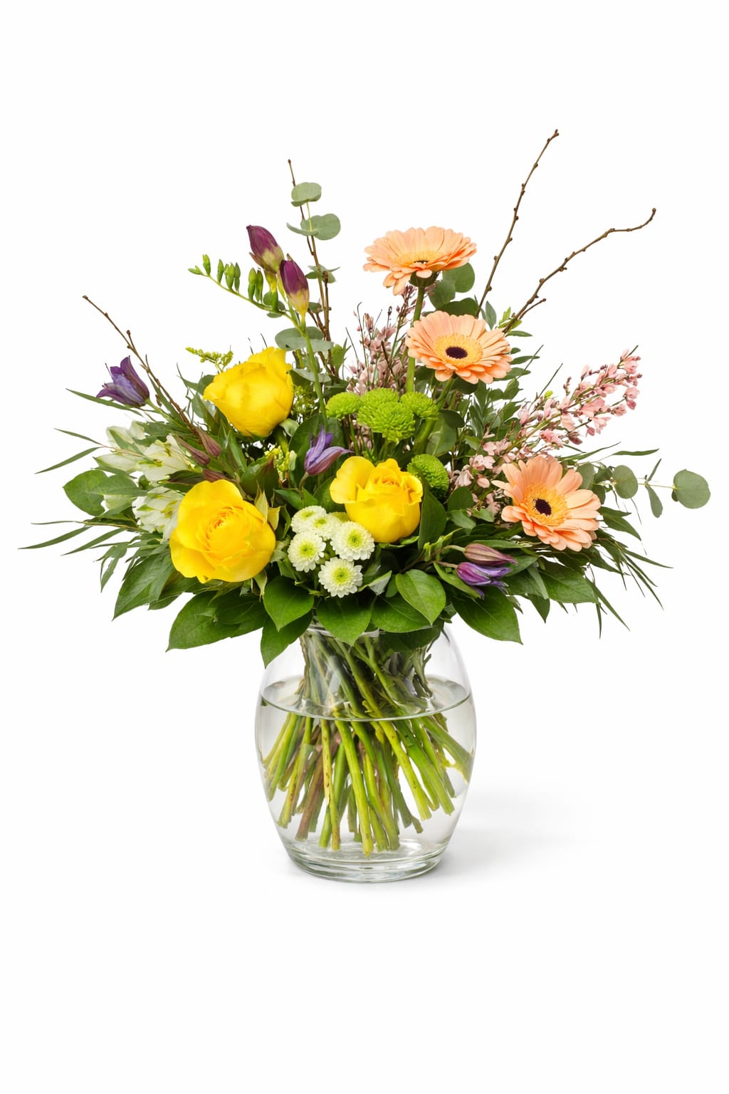 Mix kytice - růže z Ekvádoru, frézie, santina, gerbera, statice, alstromerie, clematis, janovec, salal a eucalyptus